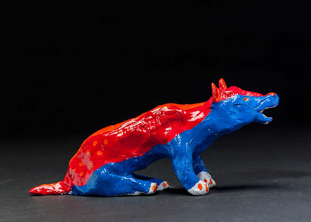 Mister Growly is a glazed ceramic sculpture in very vivid and unusual colours. Very unusual creation by Max Bullock after his stroke.