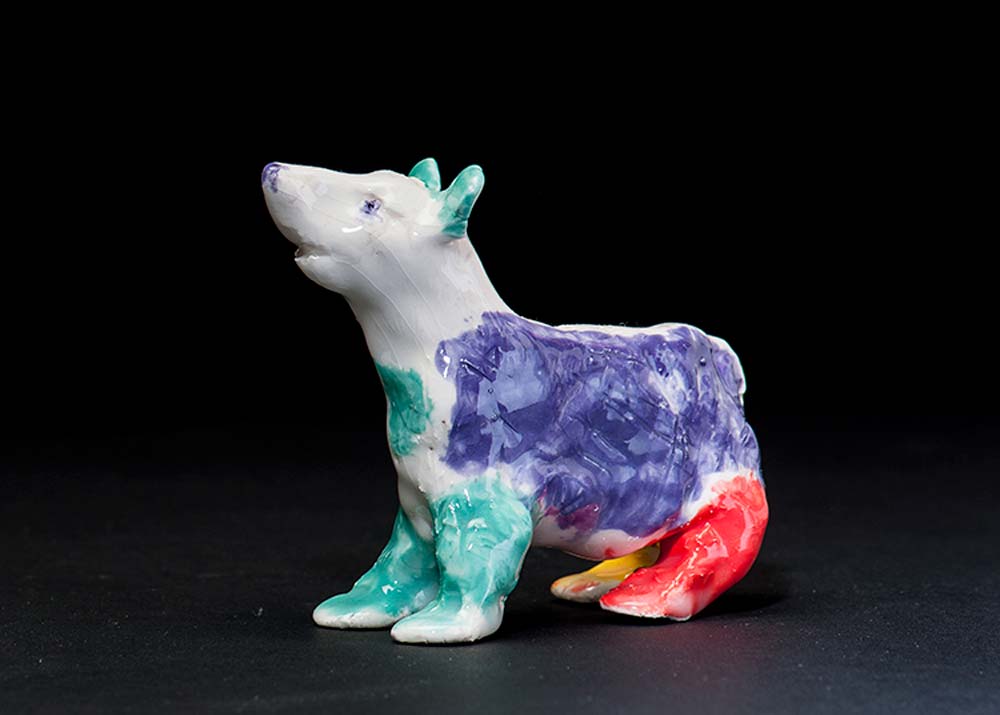 Pottery Bear 05 one of a large set of glazed ceramic bear sculptures in very vivid and unusual colours. Very unusual creation by Max Bullock