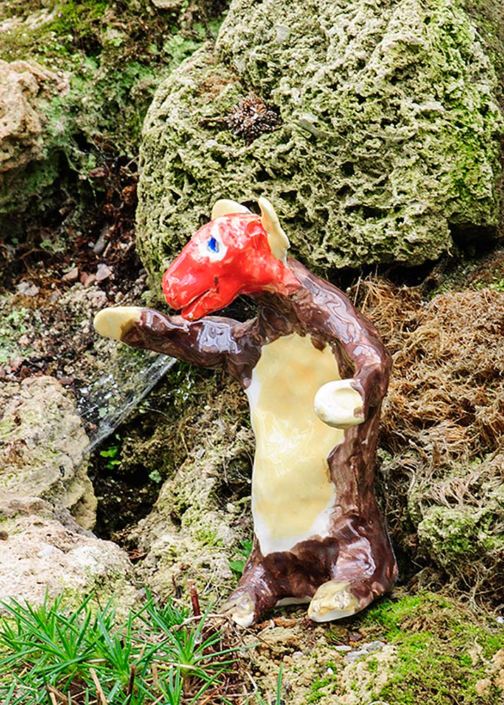 Pottery Bear 35215 is one of a large set of glazed ceramic animal sculptures in very vivid colours. Very unusual creations by Max Bullock. Photographed in a real jungle scene, down at the local Fletcher Moss rock gardens.