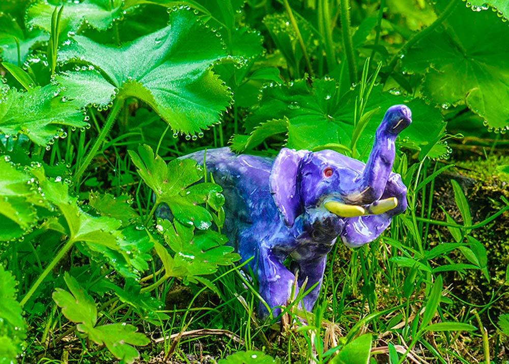 Pottery Elephant 35034 is of a the purple elephant bursting from the undergrowth.