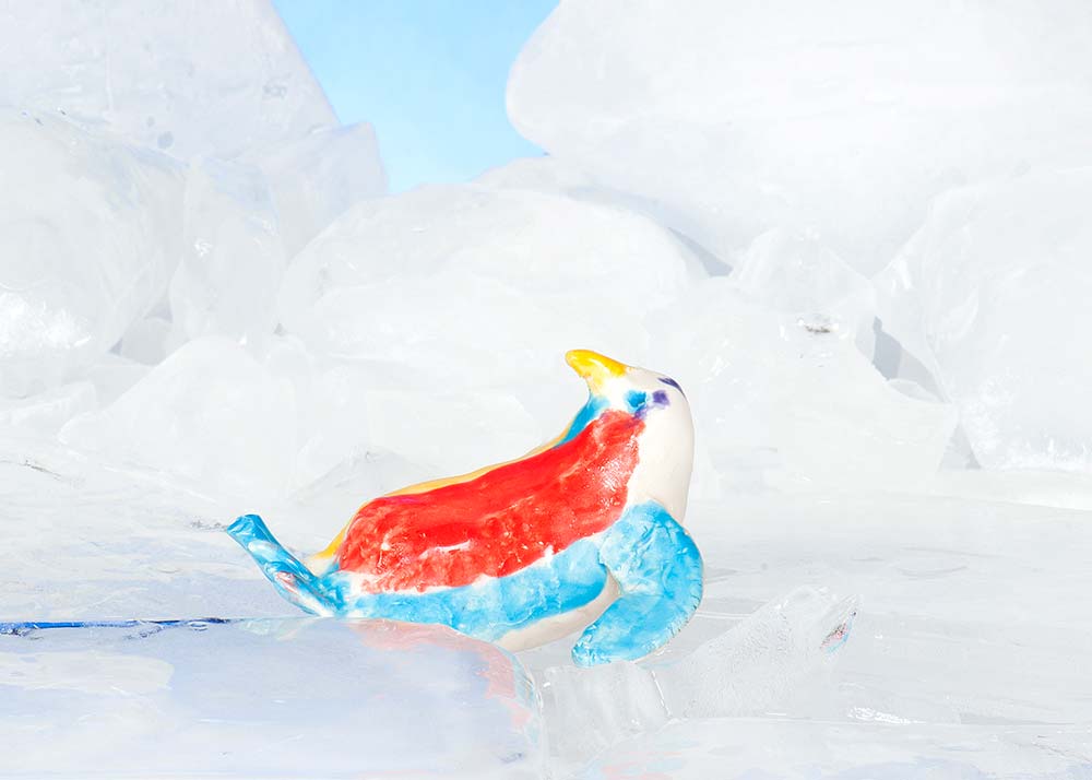 Pottery Penguin 35281 is one of a large set of glazed ceramic penguin sculptures in very vivid and unusual colours. Very unusual creations by Max Bullock. Photographed in a real icy scene.