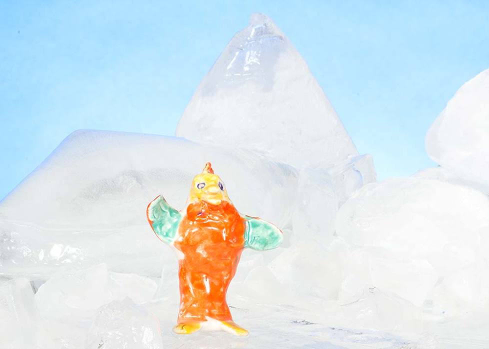 Pottery Penguin 35305 is one of a large set of glazed ceramic penguin sculptures in very vivid and unusual colours. Very unusual creations by Max Bullock. Photographed in a real icy scene.